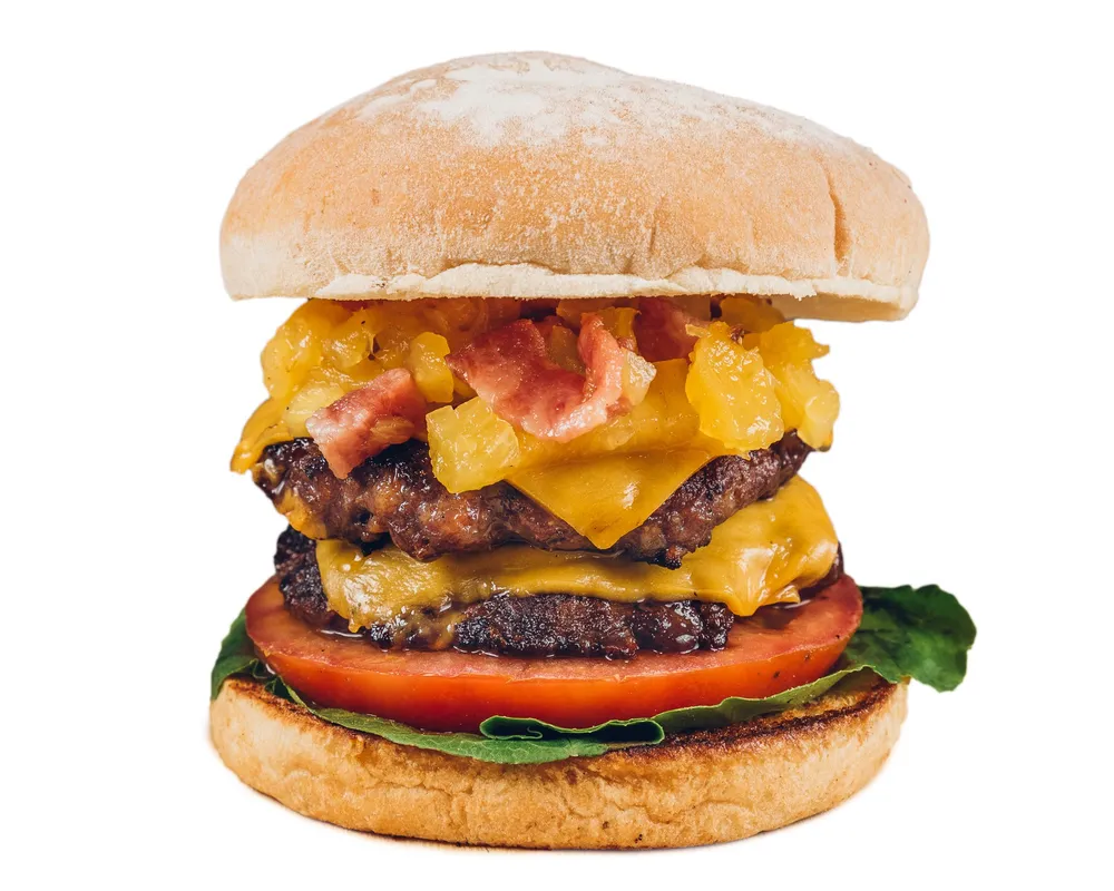 Pan, 2 carne de res 130 grs, tocineta, lechuga, tomate, queso americano y salsa jack daniels.